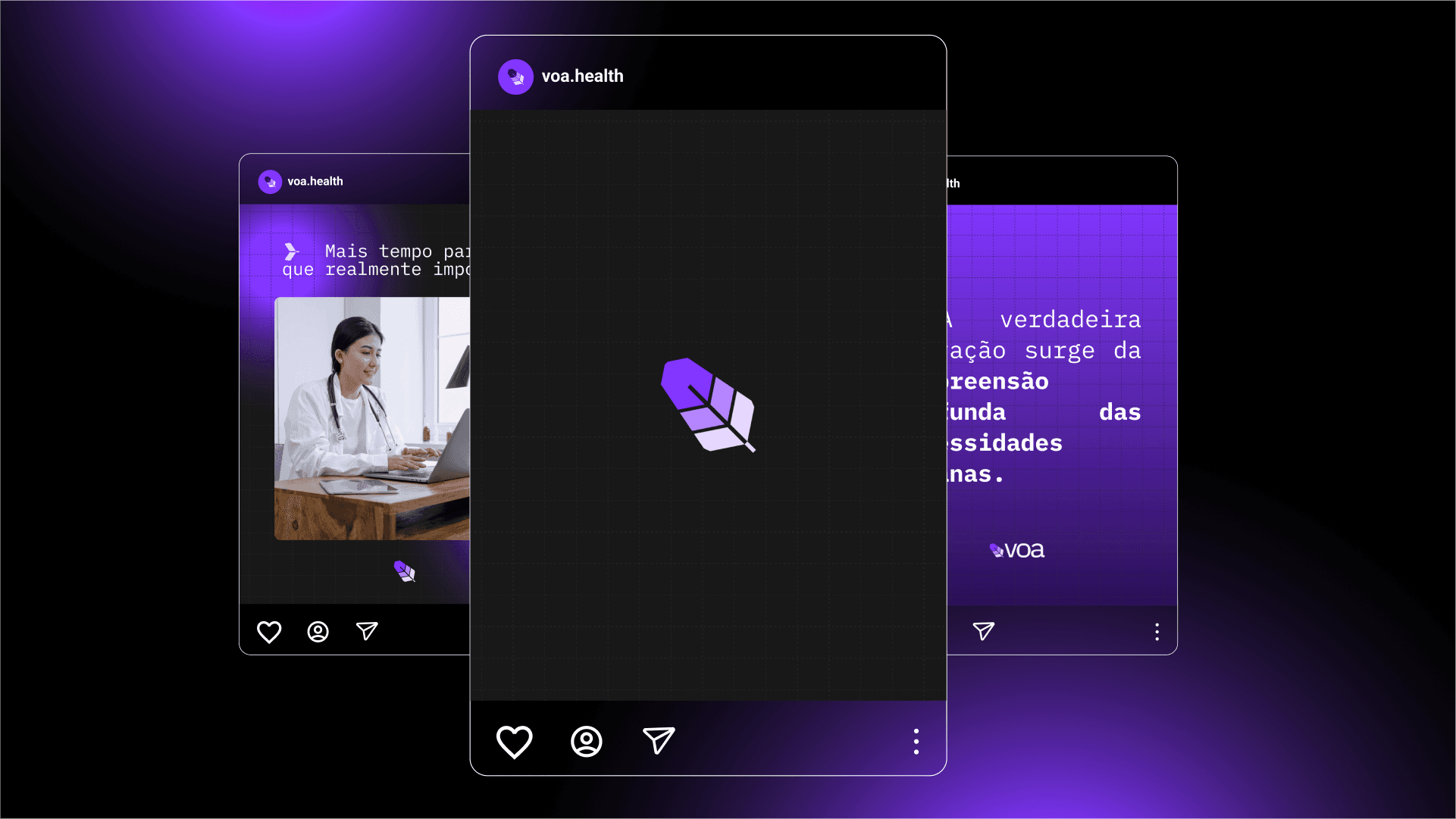 The visual identity translates concepts of ethical innovation and collaboration. Soft gradient hues represent the fluidity of human-machine interaction, while structured typography communicates medical expertise and reliability. At the core of the brand lies the feather symbol – a modern twist on the historical quill, reflecting both the lightness of Voa’s user experience and the evolution of medical documentation. The feather (or “pena” in Portuguese) subtly bridges heritage and innovation, symbolizing how Voa’s platform reimagines clinical writing: precise, agile, and liberated from outdated methods.